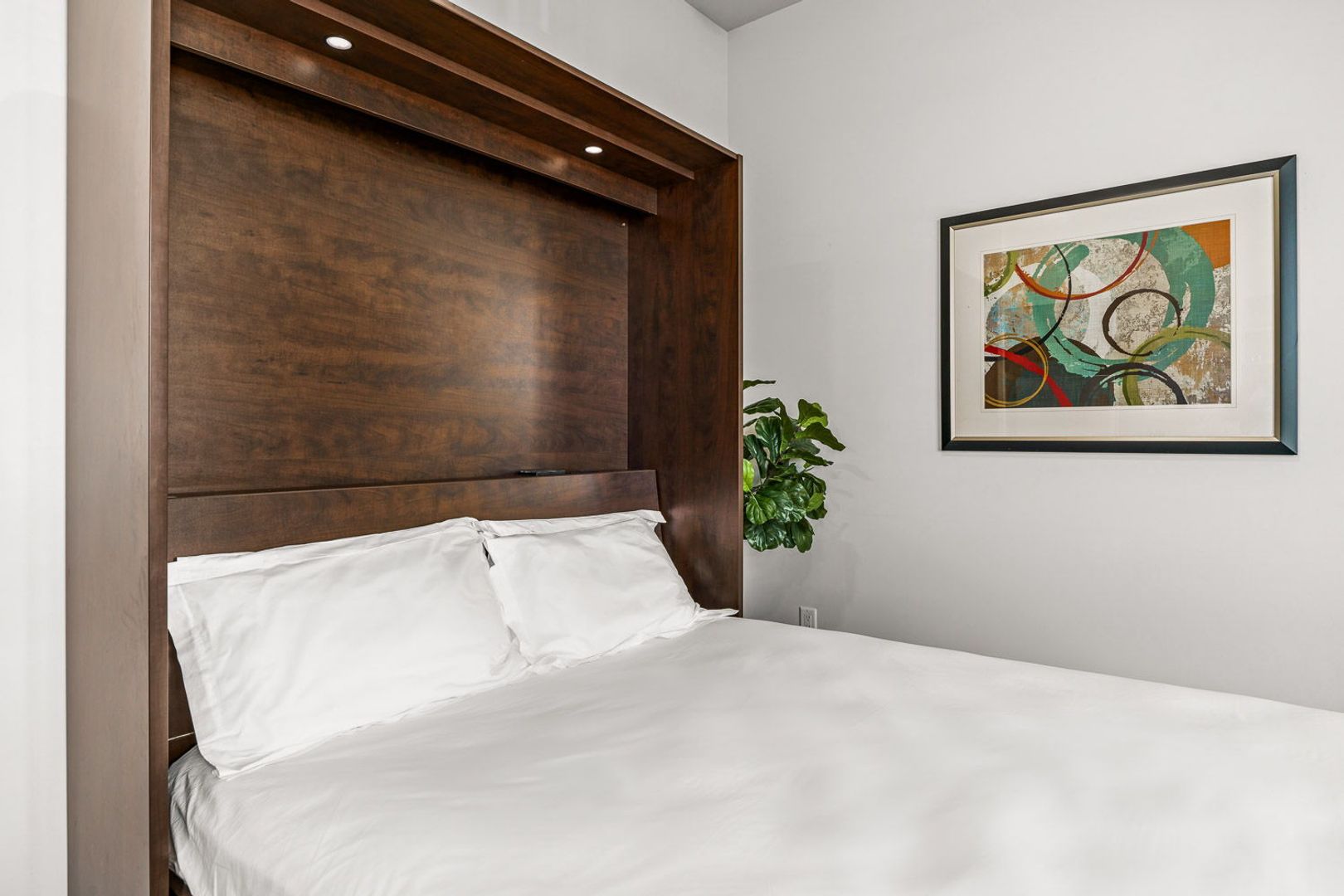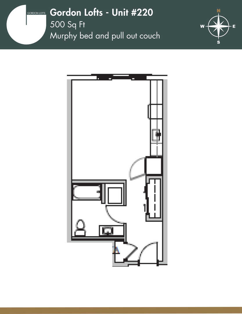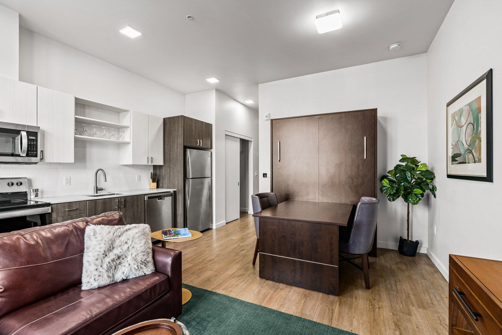 The Pearl Furnished floorplan is a traditional furnished studio apartment. Its floorplan includes a washer/dryer, electric oven and cooktop, microwave, dishwasher, fiber internet, and air-conditioning unit. This unit features LVP wood-stained planking through the kitchen. All furnished Pearl units have 1 television, modern furniture, Keurig k-pod coffee maker, and kitchen utensils. Inquire with your leasing agent whether the unit has a standard or Murphy queen/king-sized bed. *Actual floor plan availability is subject to change.