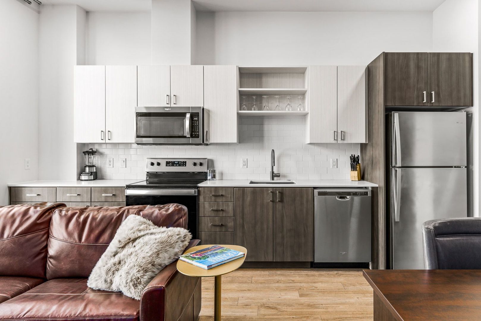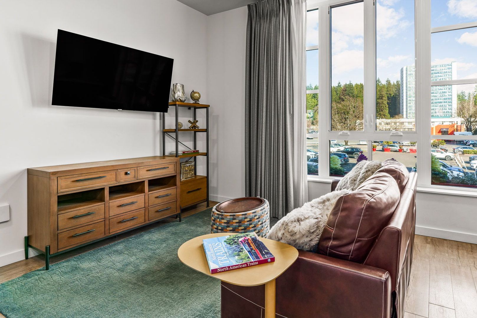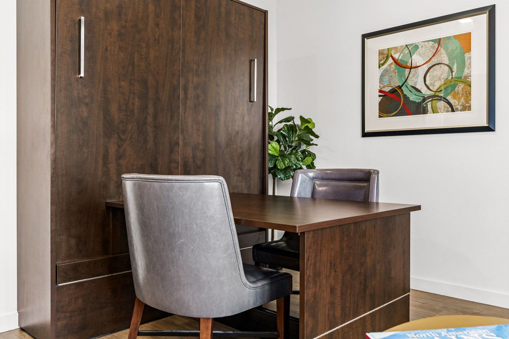 The Pearl Furnished floorplan is a traditional furnished studio apartment. Its floorplan includes a washer/dryer, electric oven and cooktop, microwave, dishwasher, fiber internet, and air-conditioning unit. This unit features LVP wood-stained planking through the kitchen. All furnished Pearl units have 1 television, modern furniture, Keurig k-pod coffee maker, and kitchen utensils. Inquire with your leasing agent whether the unit has a standard or Murphy queen/king-sized bed. *Actual floor plan availability is subject to change.