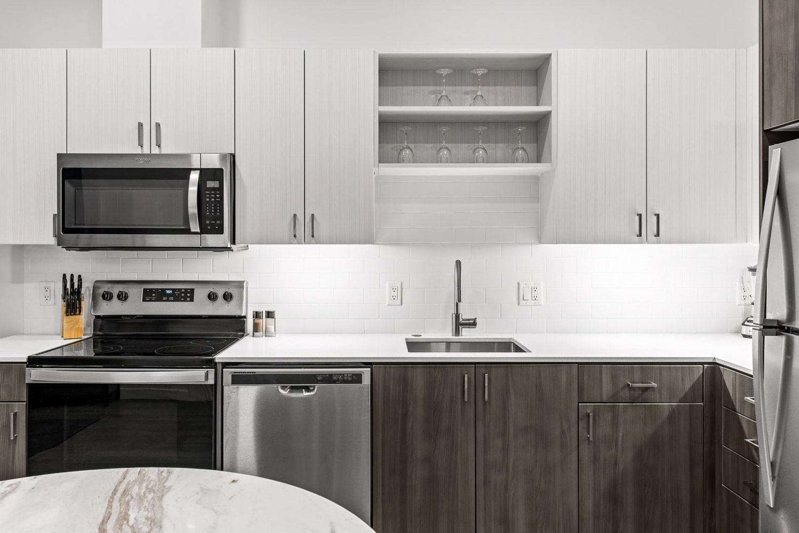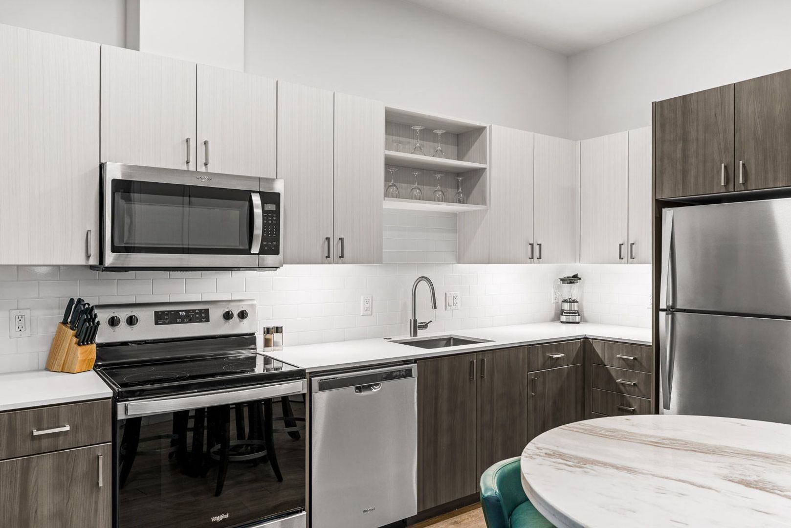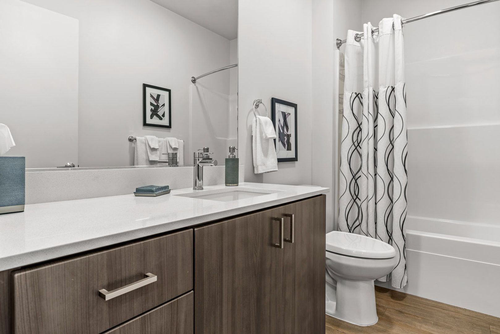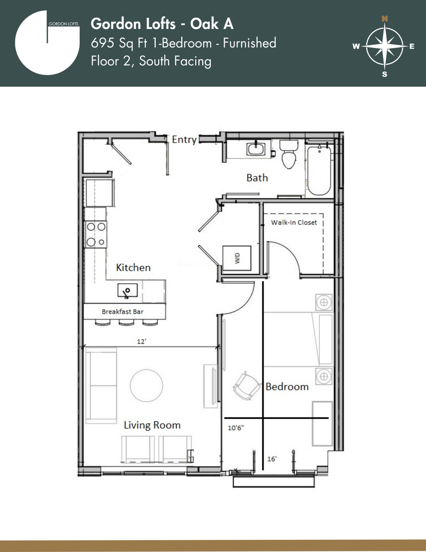 The Oak Furnished floorplan is a traditional furnished one-bedroom, one bathroom apartment. Its floorplan includes a washer/dryer, electric oven and cooktop, microwave, dishwasher, fiber internet, and air-conditioning unit. This unit features LVP wood-stained planking through the kitchen and living room and a carpeted bedroom. All furnished Oak units have 2 televisions, bed/bedding, furniture, Keurig k-pod coffee maker, and kitchen utensils. *Actual floor plan availability is subject to change.